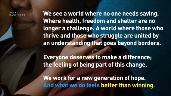 We see a world where no one needs saving. Where health, freedom and shelter are no longer a challenge. where those who thrive and those who struggle are united by an understanding that goes beyond borders. Everyone deserves the feeling of making a difference, the knowing that they were part of this change. We work for a new generation of hope. And what we do feels better than winning.